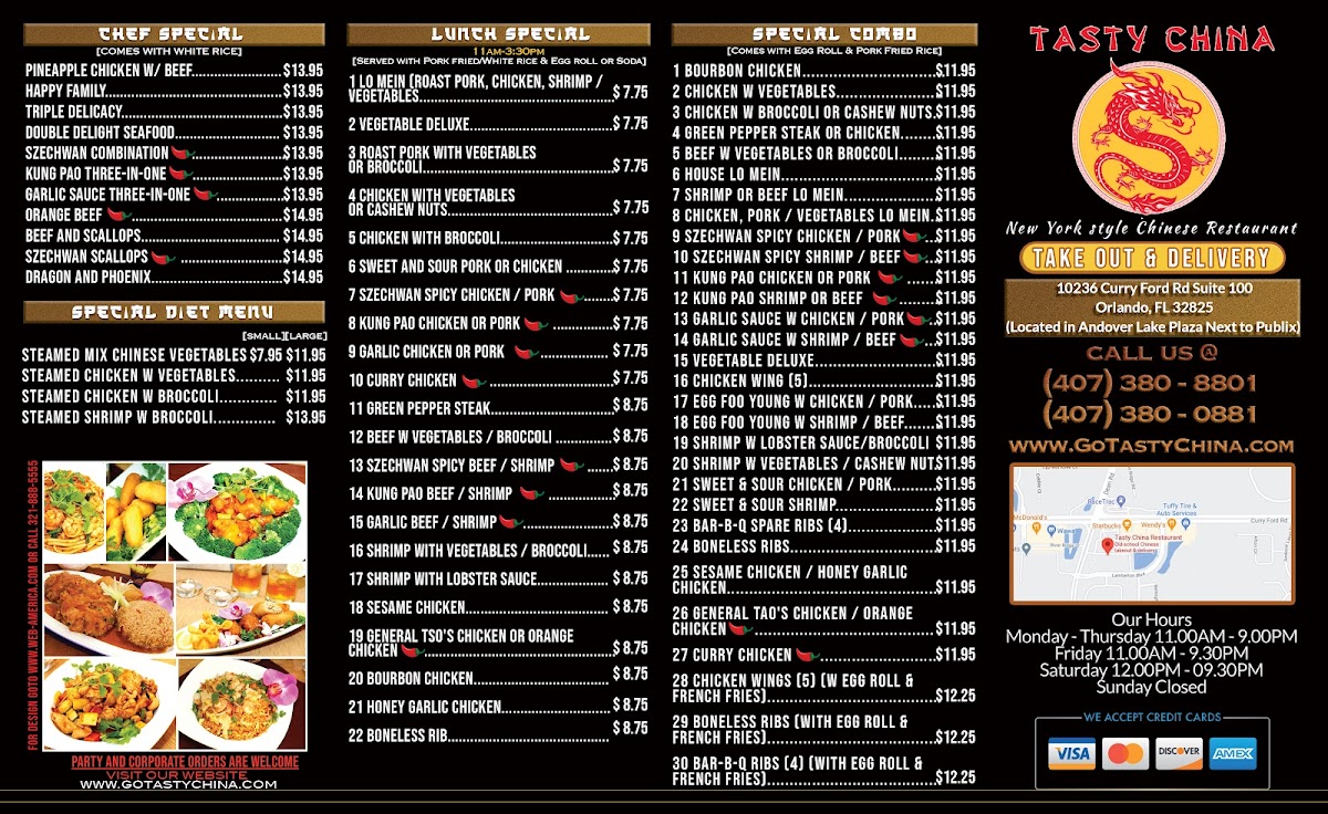 Welcome to Tasty China Restaurant, your ultimate destination for authentic Chinese cuisine in Orlando! Located at 10236 Curry Ford Rd, we pride ourselves on offering a diverse menu that satisfies every palate.