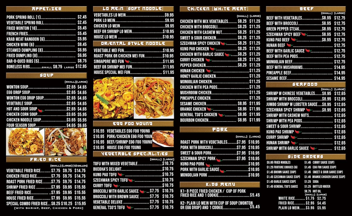 Our standout offerings include a variety of Oriental Style Noodles, such as the flavorful Vegetable Mei Fun and hearty Singapore Mei Fun, all priced reasonably under $13. For egg lovers, our selection of Egg Foo Young features delightful options from vegetables to house specials, each at a satisfying $12.95.